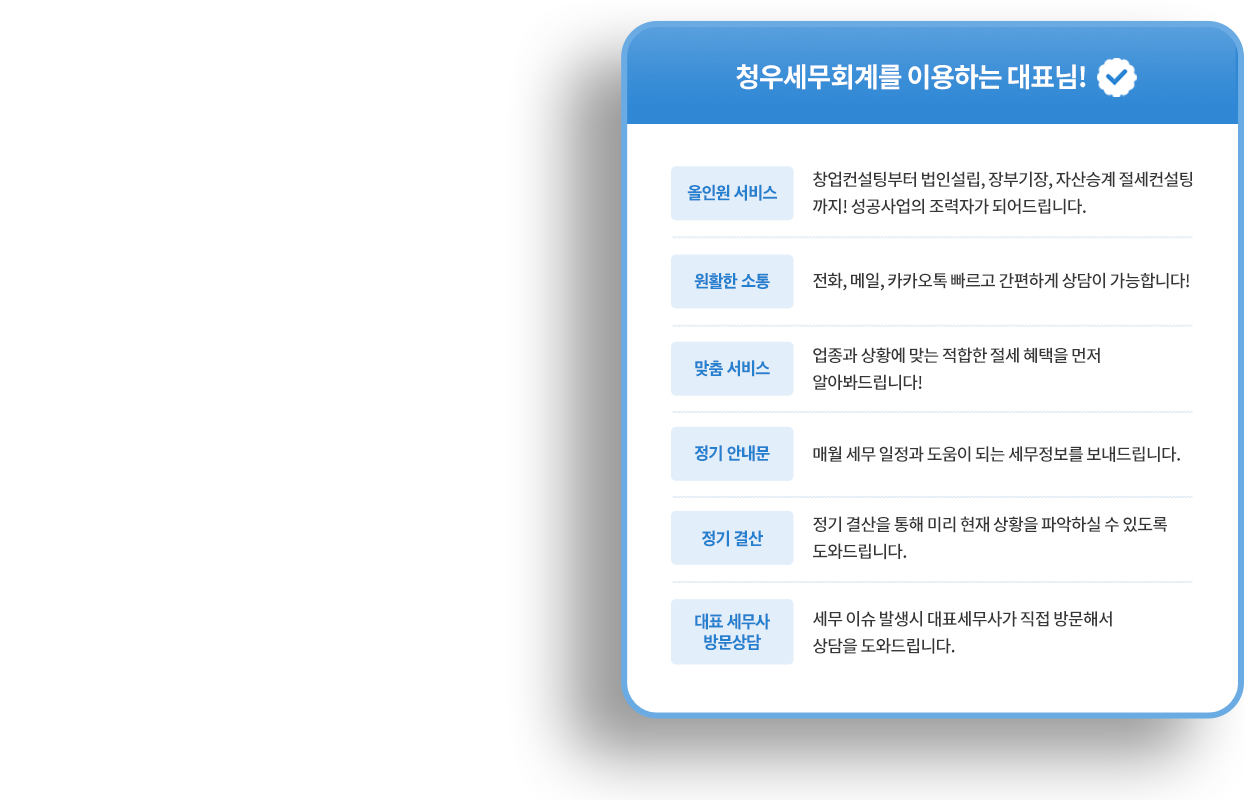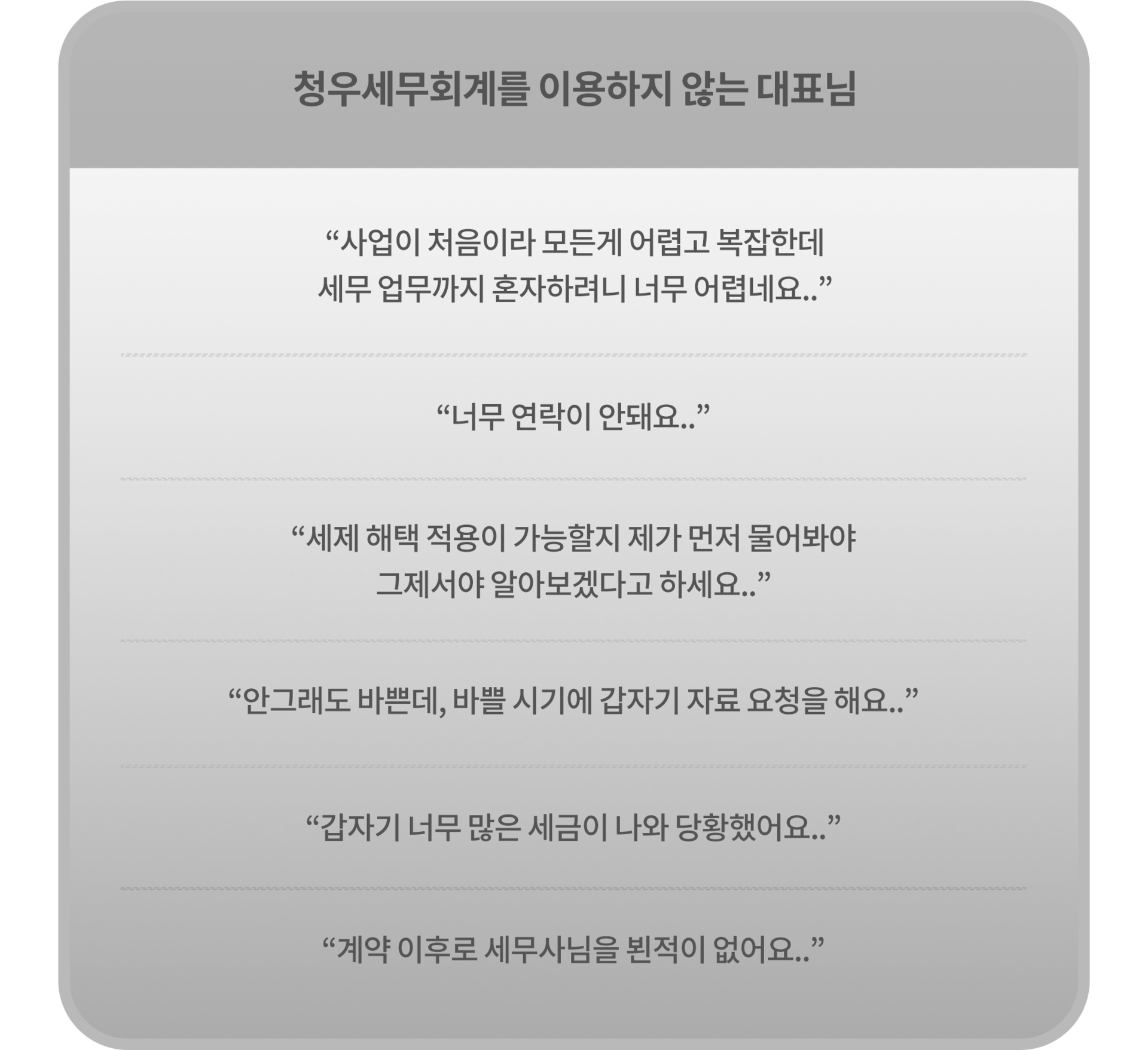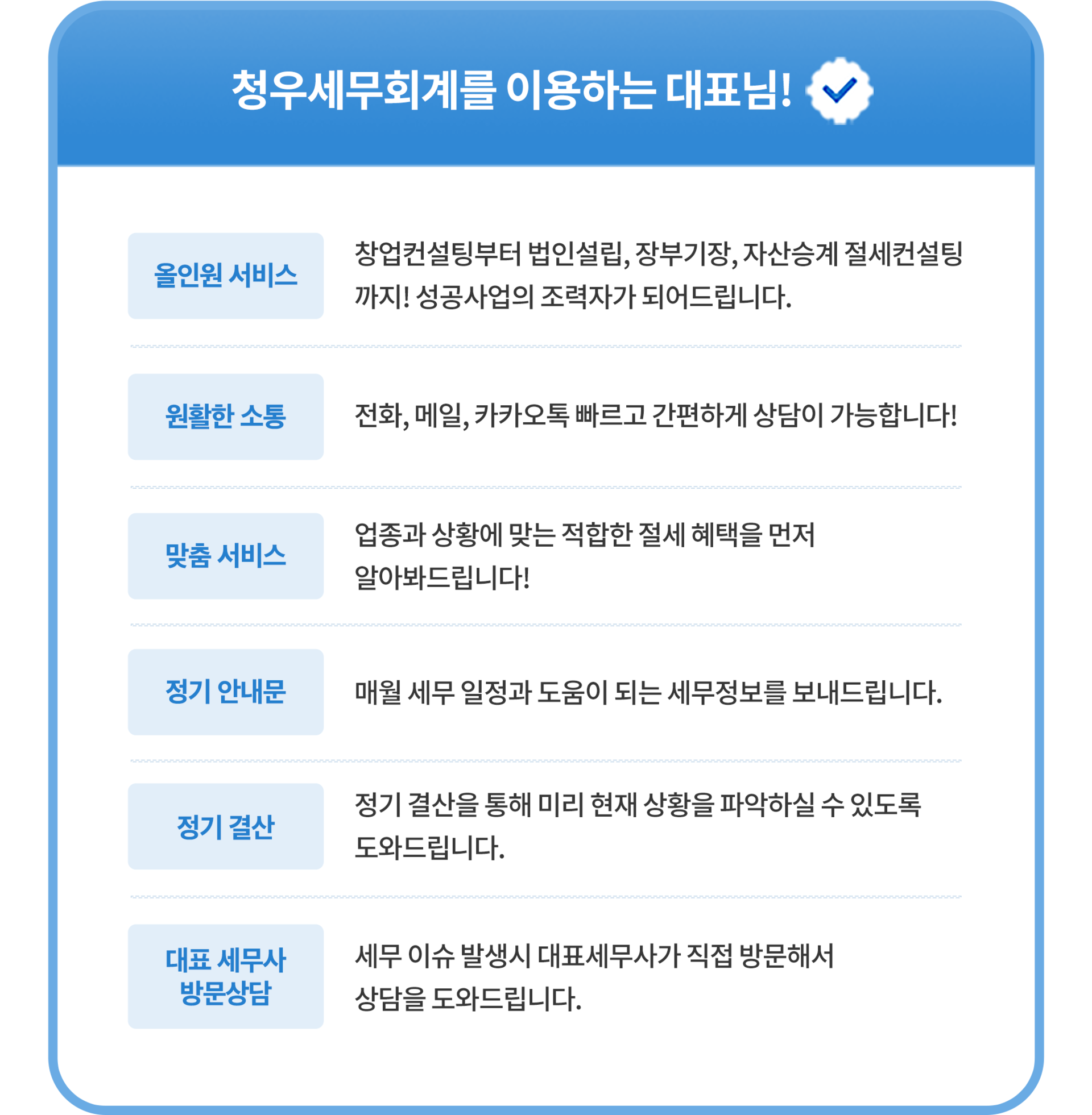 세금신고는 전문가인 청우세무회계에 맡기고 사업에만 전념하세요. 청우세무회계가 고객님의 성공사업을 돕겠습니다!