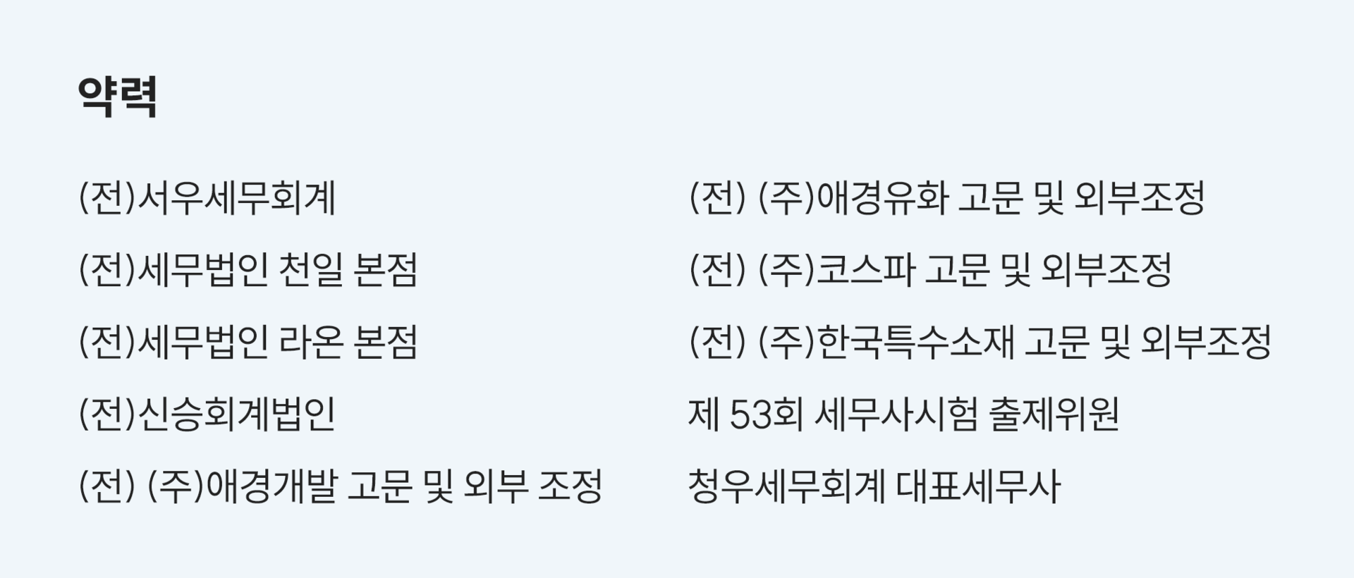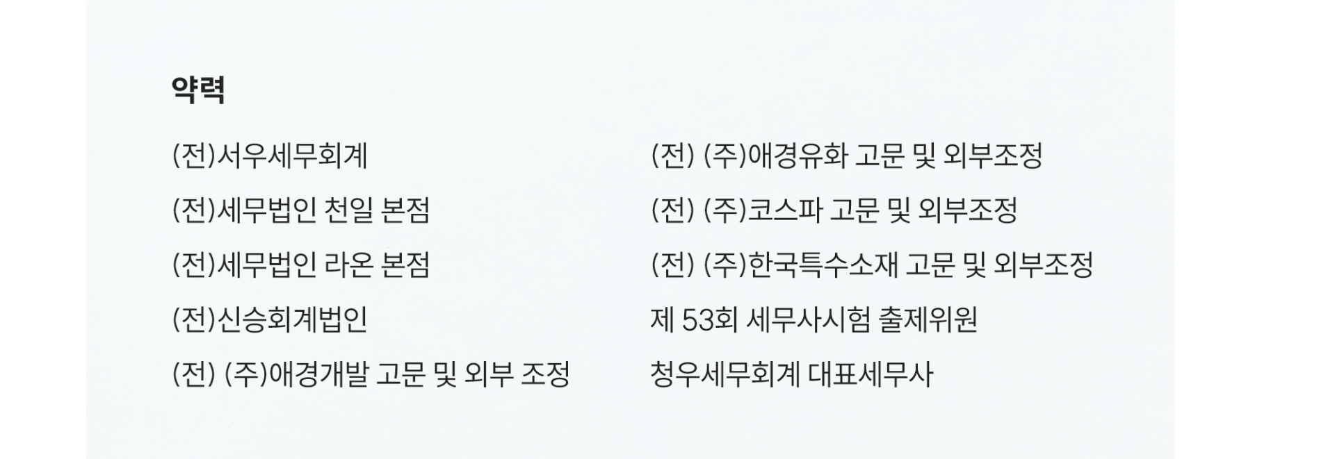 ![]() | 이용약관 | 개인정보처리방침 청우세무회계|사업자번호 : 353-06-00959 ㅣ 주소 : 경기도 하남시 덕풍동로 111, 306호 이메일 : chungwootax@hanmail.net ㅣ 전화번호 : 0507-1425-0647 Copyright © 2024 청우세무회계. All Rights Reserved | Hosting By (주)아임웹 | Design By 유어플랜 |
